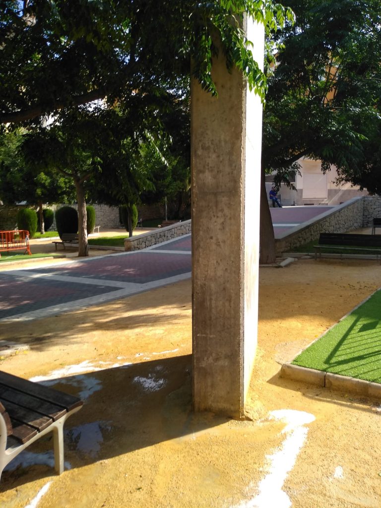 Crevillent (09/06/2020).- La Regidoria de Serveis Públics està duent a terme durant aquests dies actuacions específiques de neteja per a eliminar les pintades i grafitis del municipi en els espais especialment degradats, tant als carrers com en parcs i places, com és el cas, per exemple, de la Plaça de la Comunitat Valenciana.